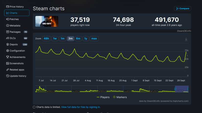 The Call of Duty: Black Ops 7 beta has had a rough beginning, with player counts reaching just under 75,000 on Steam during its first day. The beta is currently locked to those who pre-ordered or received access codes through various promotions, meaning that broader player feedback will have to wait until the open beta starts on October 5. This initial count can’t compete with the earlier beta for Battlefield 6, which hit over 521,000 players.