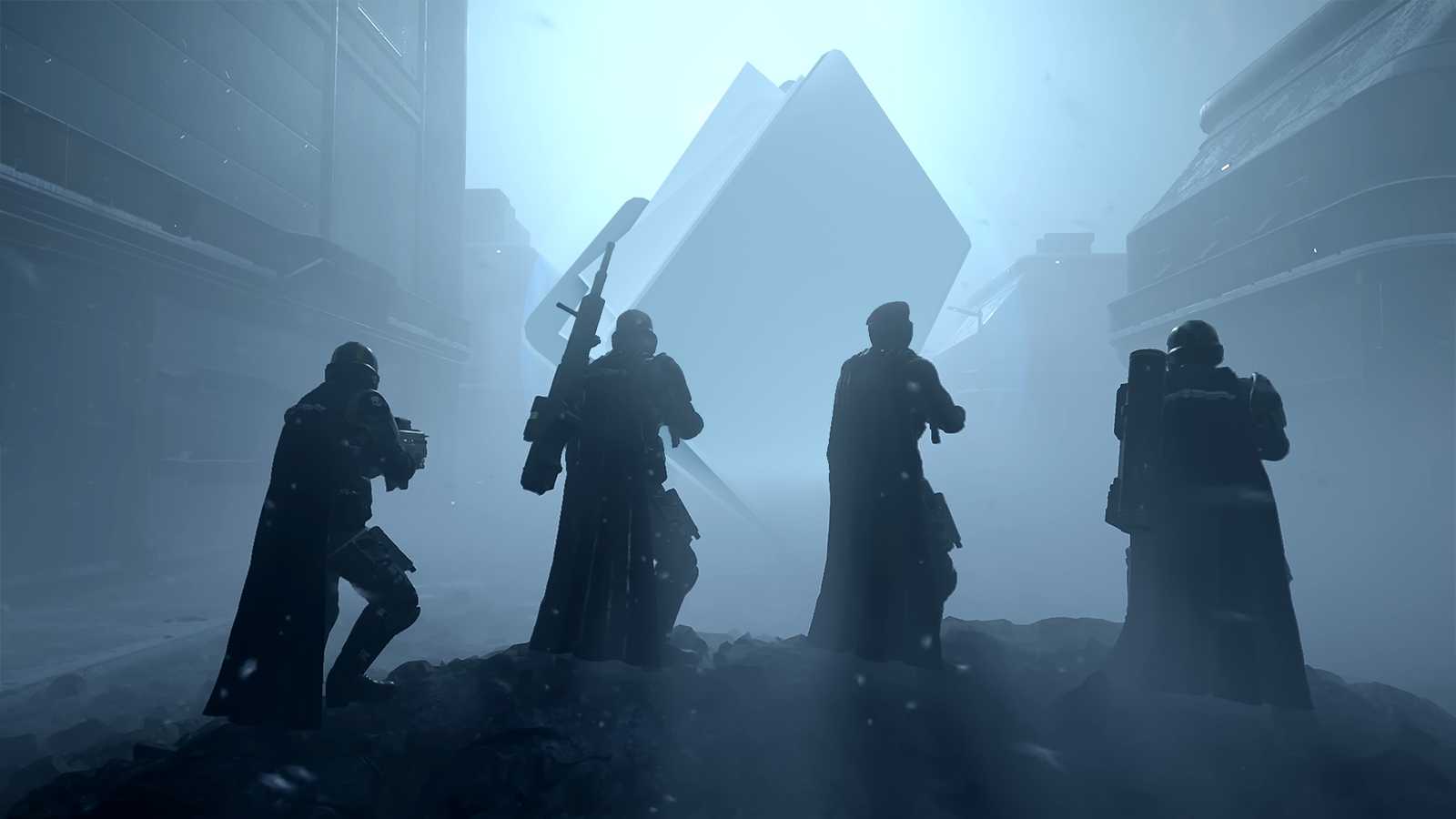 Silhouettes of a four-character party in Helldivers 2.