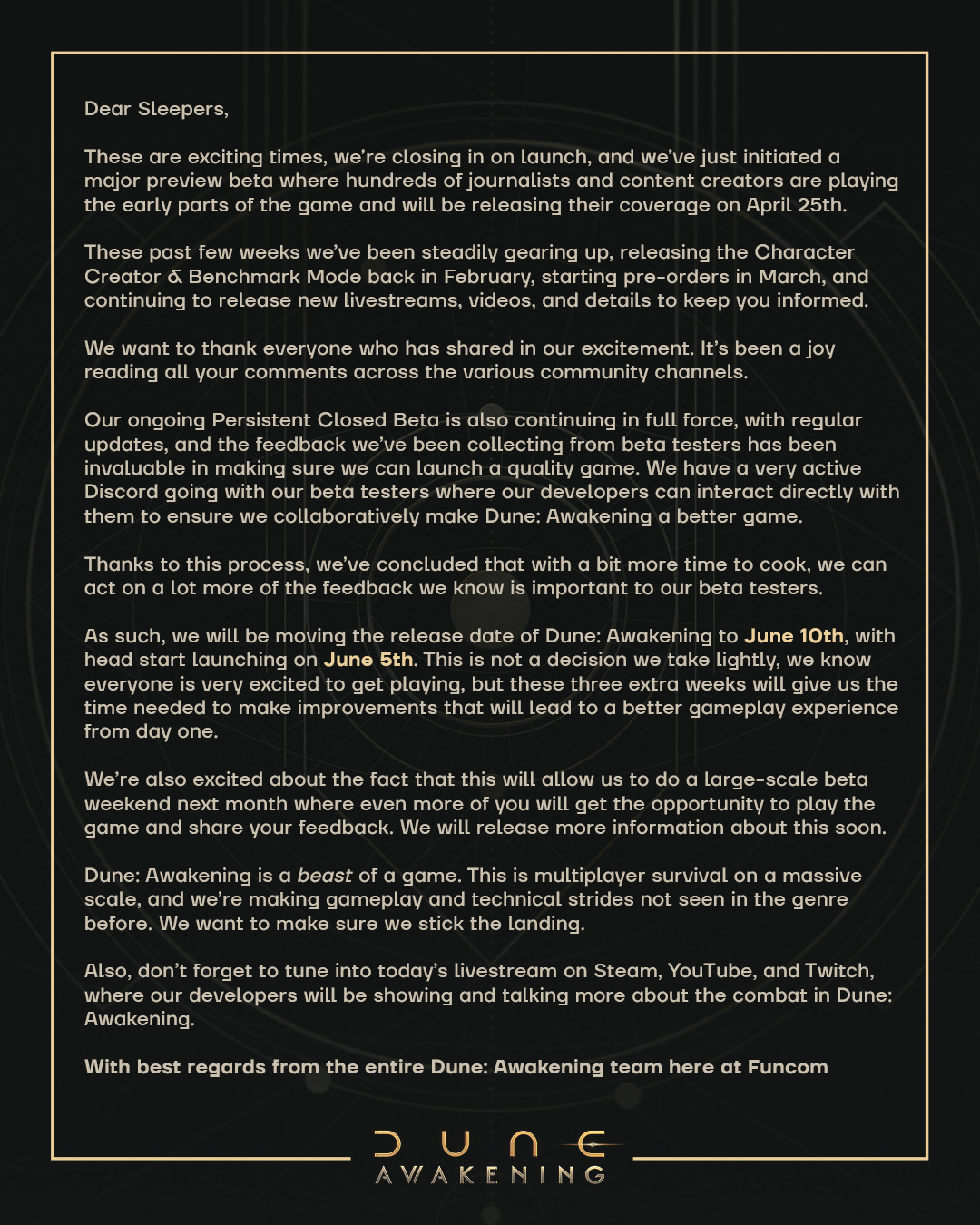 Funcom explained, “Dune: Awakening is an ambitious game. We are committed to delivering an unprecedented multiplayer survival experience, and wish to ensure we meet the expectations of our players.”